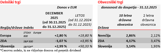 Leto 2025 so zaznamovali izrazita politična negotovost, uvedba visokih ameriških carin in nihanja v tehnološkem sektorju zaradi umetne inteligence (UI). Leto je bilo izjemno donosno za evropske in slovenske delnice, pri čemer so se prve podražile za +19,8 %, slednje pa za +58,0 %. Donosnost v ameriških dolarjih je bila tudi precejšnja za ameriške delnice (+17,9 %), vendar je zaradi krepitve evra skozi leto (+13,4 %) donosnost v evrih precej nižja, in sicer pri +3,9 %. Na ameriškem delniškem trgu sta bili najdonosnejši panogi komunikacijskih storitev (+17,8 %) in informacijske tehnologije (+9,4 %), najmanj donosni pa panogi potrošnih dobrin (-8,4 %) in nepremičnin (-9,0 %). Na evropskem delniškem trgu se je najbolj izkazal bančni sektor, ki se je podražil za +76,7 %, najmanj donosen pa je bil sektor medijev (-12,8 %). Kaj je gnalo ali zaviralo kapitalske trge v letu 2025 pa v nadaljevanju.
