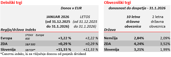 Stopnjevanje geopolitičnih tveganj je povzročilo stekanje denarja predvsem v varnejše naložbe, med drugimi tudi zlato, ki je malo pred koncem januarja doseglo novo zgodovinsko vrednost pri 5417 dolarjih. Januarski skok cene zlata do rekorda za +25,4 % nakazuje na zaskrbljenost trgov glede geopolitike, posledično pa iščejo varna zatočišča. V januarju so se ameriške delnice praktično ostale nespremenjene, z minimalno rastjo v višini +0,3 %. Evropski delniški trgi so pokazali precejšnjo odpornost. Po začasnem zdrsu sredi meseca zaradi geopolitičnih napetosti glede Grenlandije so si opomogli in zabeležili +3,2 % donos.