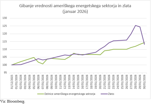 Glavno dogajanje v začetku meseca je povzročila vojaška operacija ZDA v Venezueli, ko so Američani odpeljali na sojenje takrat aktualnega predsednika Venezuele Madura in njegovo ženo zaradi kaznivih dejanj, povezanih z drogami. Dodatno je ameriška administracija izpostavila težnjo po dostopu do venezuelske nafte in omejitvi njenega dostopa do Madurovih držav partneric – Kitajske, Kube, Irana in Rusije. Venezuela je država z največjimi dokazanimi zalogami nafte, zato je vojaško posredovanje posledično takoj sprožilo strah pred dolgotrajno prekinitvijo dobavnih verig in rast cene nafte za +13,6 % v januarju. Cena nafte brent je konec januarja dosegla 70,7 ameriških dolarjev. Višje cene nafte so se prelile tudi v višja prihodnja pričakovanja dobičkonosnosti naftnih družb in posledično so se ameriške naftne družbe v januarju podražile za +13,1 %1. Venezuelsko dogajanje je dodalo rahli zagon tudi rasti zlata.